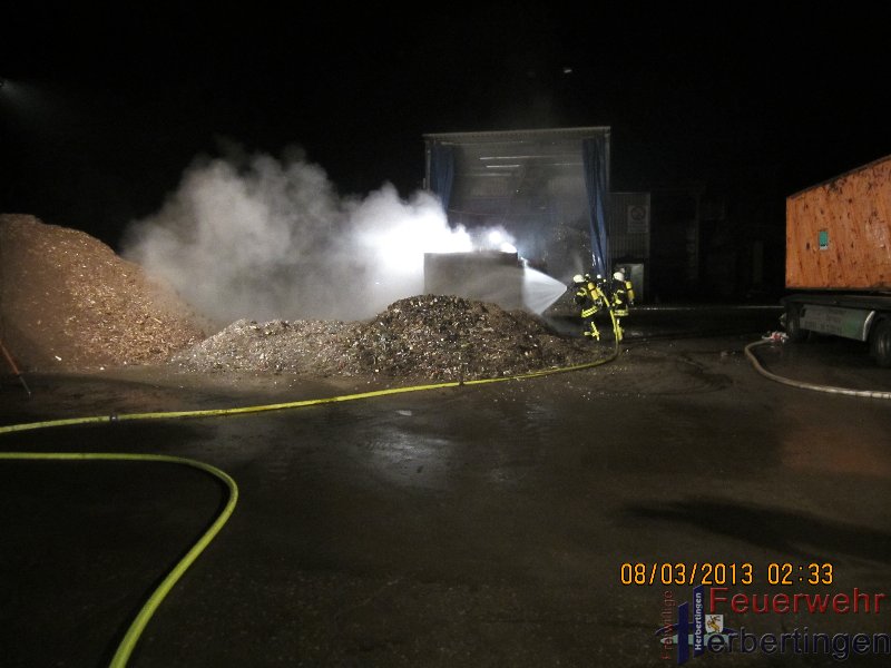 Beim Eintreffen der Kräfte konnte ein Schwelbrand in einem Abfallhaufen festgestellt werden. Um eine Ausdehnung des Brandes zu verhindern wurde der Haufen mittels Radlader abgetragen und an einer freien Stelle abgelöscht.