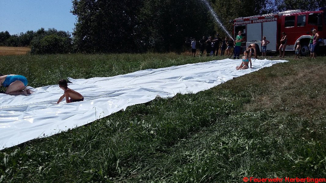 Bevor es dann zur großen Überraschung ging, konnten sich alle Teilnehmer bei Grillwurst und Wecken stärken. Nun folgte das Highlight: Aufgrund des hochsommerlichen Wetters durften die Kinder eine besondere Wasserrutsche erleben. Diese wurde aus Siloplanen gefertigt und mit Wasser aus dem HLF bewässert. Bei dieser „Überraschung“ hatten alle sichtlich viel Spaß. Kaum einer blieb bei diesem Event mehr trocken, was aber auch gleichzeitig der letzte Programmunkt dieser Veranstaltung war.
