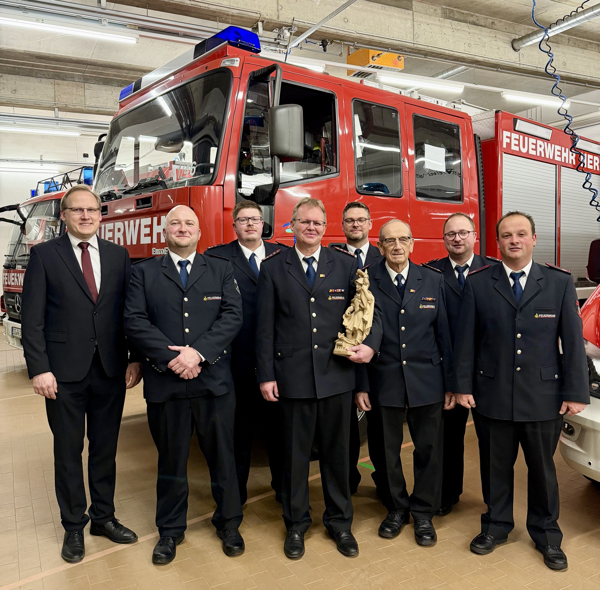 Zum Abschied aus dem Amt überreichten die Mitglieder der Feuerwehr Martin Eisele eine handgeschnitzte Figur des Heiligen Florians. Zudem würdigte die Gemeinde seine Verdienste mit einem Präsentkorb sowie einem Gutschein für einen Aufenthalt im Feuerwehrhotel am Titisee. Der neue Kommandant Yannick Blersch bedankte sich in seiner anschließenden Rede herzlich bei seinem Vorgänger für dessen außergewöhnlichen Einsatz, seine Verlässlichkeit und die vielen Jahre der Führung und Verantwortung für die Feuerwehr Herbertingen. Auch der Kreisbrandmeister berichtete aus dem Landkreis und sprach Martin Eisele seinen besonderen Dank aus. Ein Grußwort überbrachte außerdem die Nachbarwehr aus Bad Saulgau.