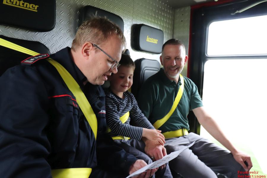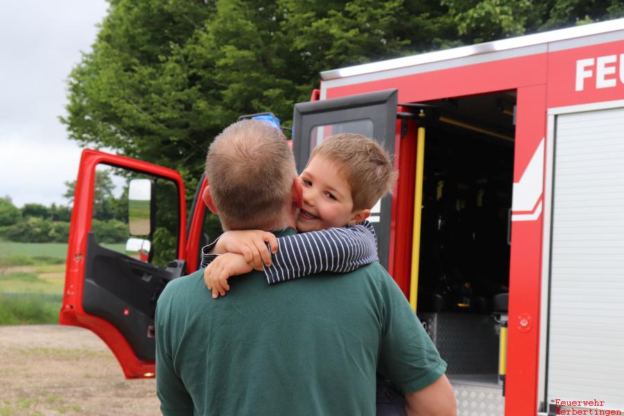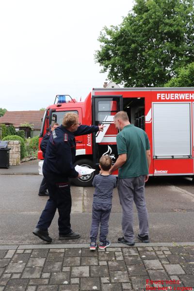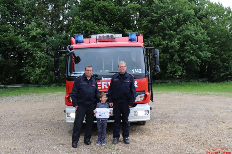 Am Donnerstag den 04. Juni 2020 staunte Raphael nicht schlecht, als vor seiner Haustür ein großes Feuerwehrauto vorfuhr und die Feuerwehrmänner auch noch bei ihm klingelten. Zusammen mit seinen Eltern und seinem Bruder öffnete er die Tür. Kommandant Eisele bedankte sich bei ihm und seinem Bruder für das tolle Bild und die Süßigkeiten und lud ihn zu einer Rundfahrt mit dem Feuerwehrauto ein. Kurze Zeit später stieg er aufgeregt zusammen mit seinem Papa in das Löschfahrzeug ein.