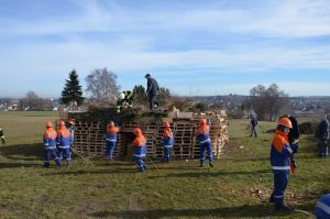 Zu erst wurde ein Gerüst aus Paletten gebaut, auf welches dann diverses Geäst, Holz und Zweige gestapelt wurde. Damit der Funken seine Form bekam, wurden rings um das Gerüst sowie obenauf die im Januar eingesammelten ausgedienten Christbaume gelegt. Zum Schluss wurde der Funken mit Stroh ausgestopft, damit er auch gut brennt. Alle Helfer bekamen nach getaner Arbeit ein Vesper vom Albverein.