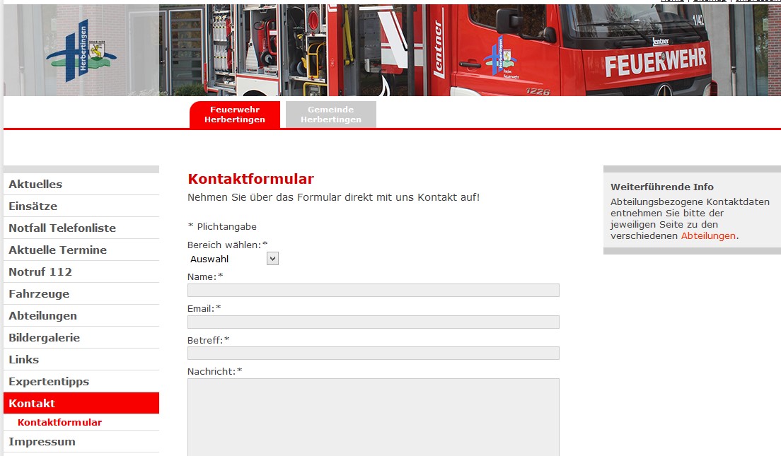 Wählen Sie dann bitte den Bereich aus, den Sie gerne kontaktieren würden. Zur Auswahl stehen beispielsweise Redaktion, Wehrführung und Jugendfeuerwehr. Sie haben zusätzlich die Möglichkeit eine Datei anzuhängen. Das funktioniert auch mit Bildern direkt von Ihrem Smartphone.